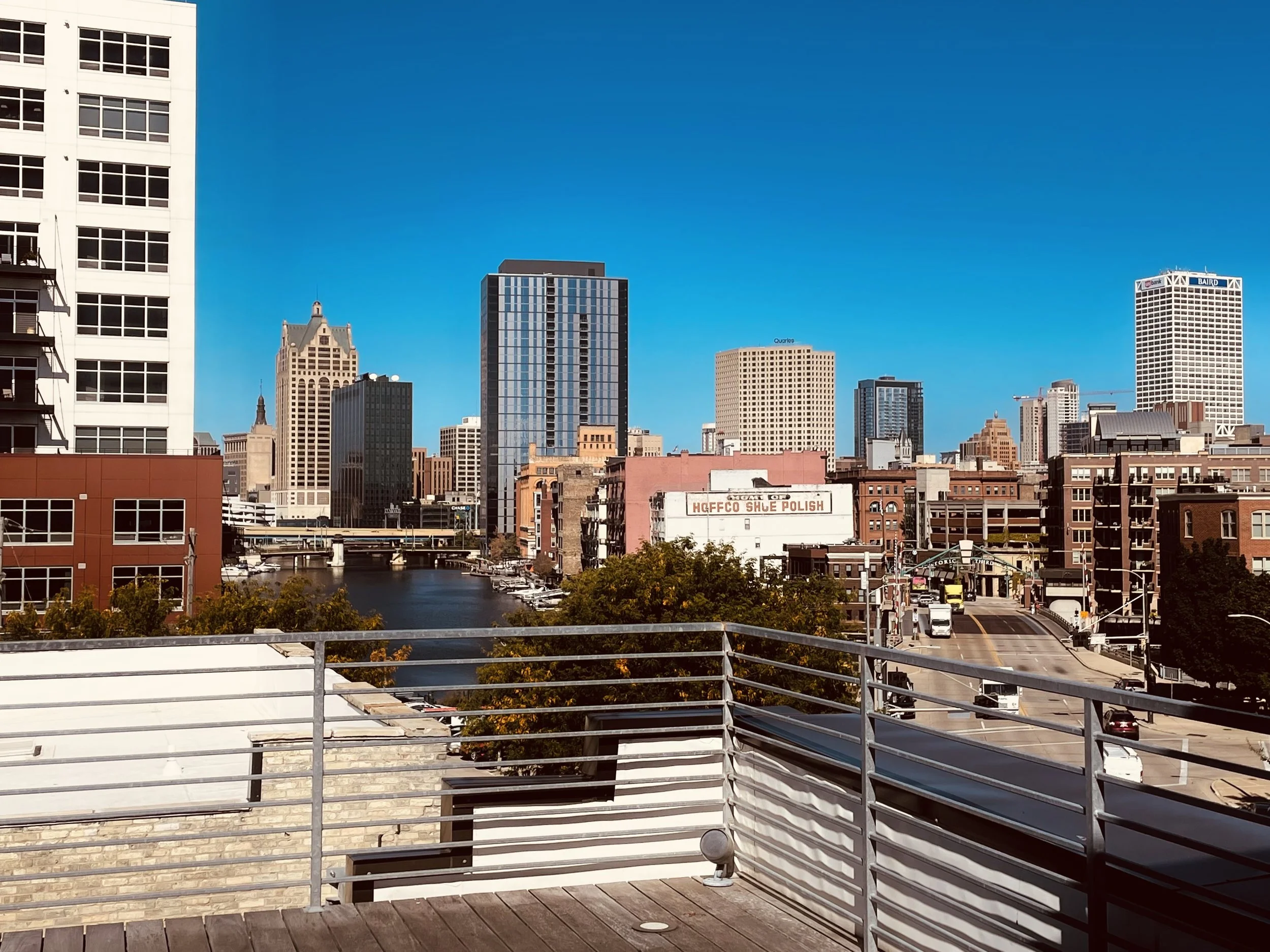 Roof-top patio overlooking the Milwaukee skyline and the Milwaukee river